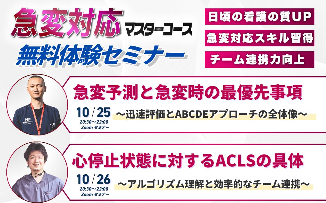 Medical Challenge「急変対応マスターコース」無料セミナーを、2025年10月25日・26日の2夜連続で開催いたしました。オンライン形式で実施した本セミナーには、多くの看護師の皆さまにご参加いただき、急変対応に必要な視点や考え方を学ぶ、充実した2日間となりました。