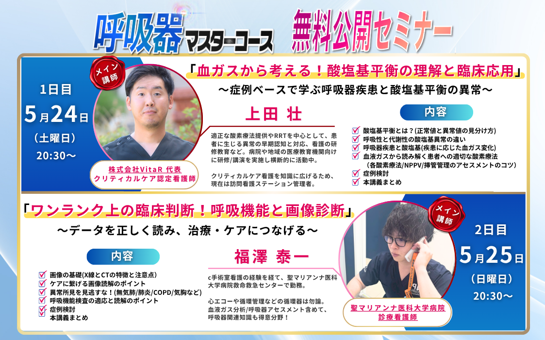 Medical Callenge「呼吸器マスターコース」無料セミナーを2025年5月24~25日に開催いたしました。オンラインで開催した本セミナーには、2日間合計で、1400名を超える皆さんにご参加いただき、学びのひと時となりました。